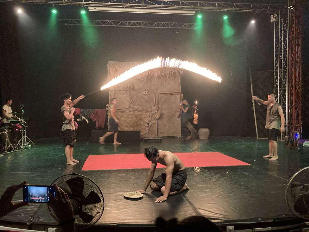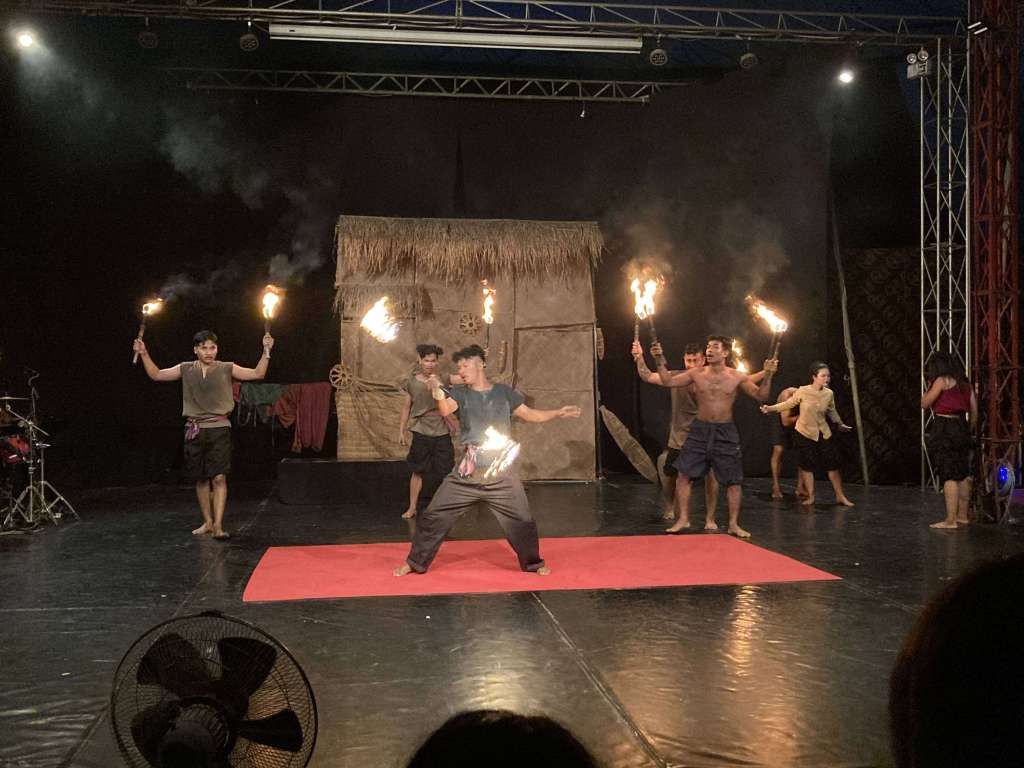 Battambang is the home of the Phare Circus, the school where all the circus training takes place. The show is a way of giving the students an opportunity to showcase their skills in front of a live paying audience and we were advised as we purchased our tickets, that the show would not be as polished as the Siem Riep show we had already seen – ‘they may drop things and fall over…’ said the ticket agent. Hopping into the hotel TukTuk, we were dropped off at the Phare gates at the end of an incredibly potholed and bumpy lane. We were able to pick up tickets without any trouble, so grabbed a couple of beers and some snacks before taking our seats in the big top. Our high expectations did not need adjusting at all, despite the ticket guys warning, the show may have lacked some of the more skillful acrobatics, but the fire juggling and flaming skipping rope section were just as spectacular.