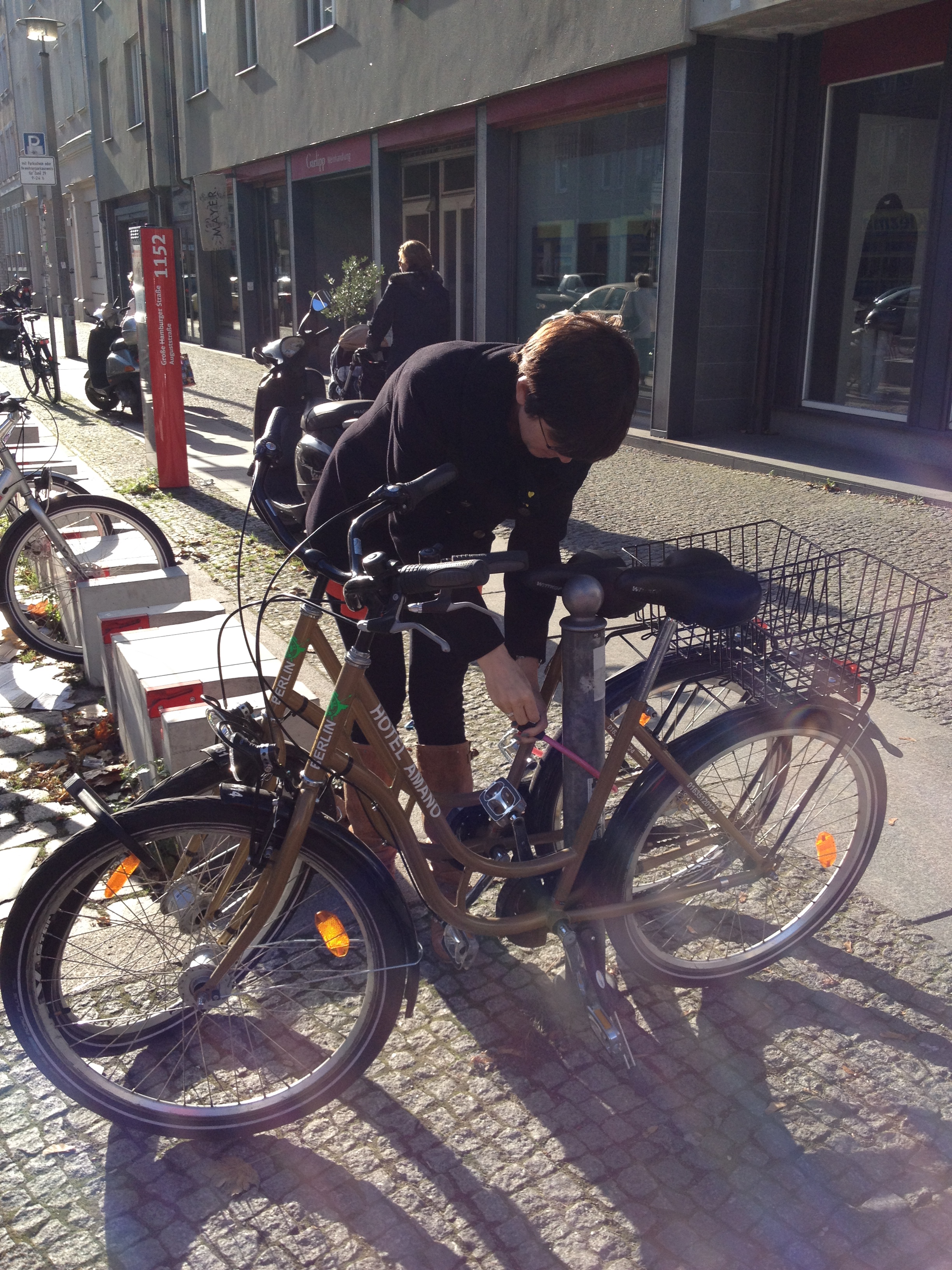 Mrs Y locking the rental bikes before taking breakfast in our favourite Fruhstuck vendor.