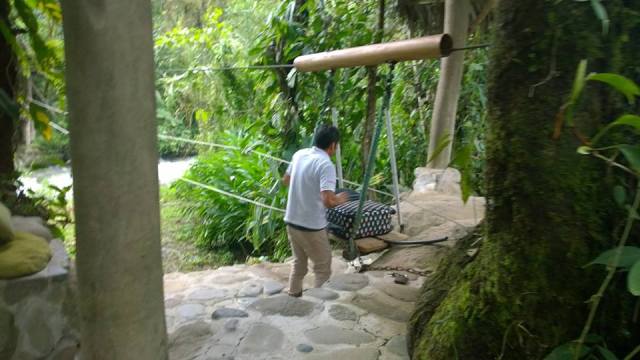Pulling up at our destination, we needed to cross a river to get in to the lodge, a bench suspended on a rope with pulleys was to be our transport across the swollen river. Our bags crossed first, pulled by our guide John, who swiftly returned the carriage for us to climb aboard.