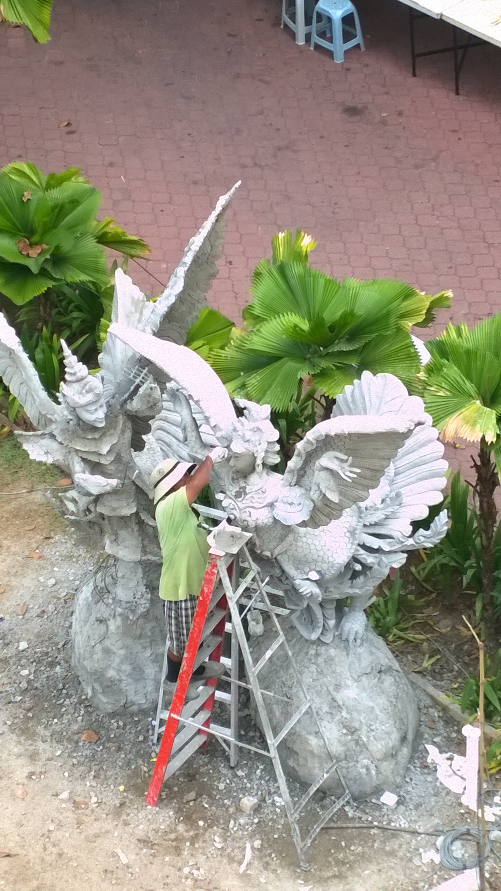 Creating a statue from wet cement.
