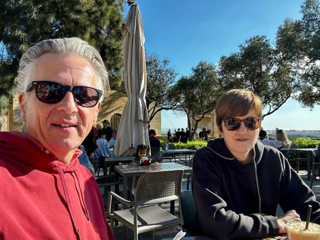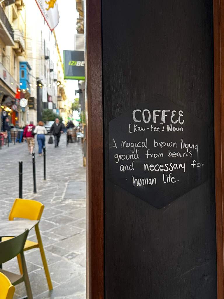 Aware that this was our last chance to explore Valletta, we took a gentle wander through the streets back to the ferry port. We are not souvenir purchasers so it was more about enjoying the ambience and the quiet back streets. On one of the very steep narrow side streets, just two roads back from the ferry, we found a tiny coffee shop (5 Beans) that more than made up for our lacklustre lunch. Great service and great tasting coffee and cakes!
