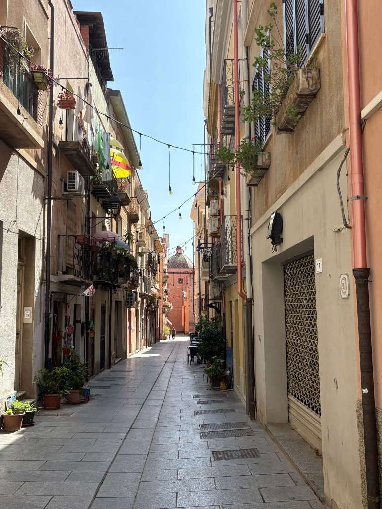 With the days being intensely hot, we decided to grab breakfast and take a morning trip to the island we could see from our room (Sant Antioco) and visit Calasetta. The short journey was itself an experience with the road across the causeway surrounded by salt flats populated by flamingos. The island was quiet along with the roads, making it an easy trip and parking was really straightforward – on the waterside with plenty of spaces. By the time we arrived the sun was very strong so we made our way along the waterfront to the rocky beach, regretting that we hadn’t brought our swim gear! The sea breeze took some of the heat away, we found a flat rock near the water and watched the comings and goings in the bay, time seemed to evaporate. To avoid walking too far in the heat we checked out the opening times of some local bars and their proximity to us before taking a gentle stroll up into the main square. Bars were slowly beginning to open up, setting up outside seating areas with umbrellas etc so we sat a while in the square before wandering along the main street for a drink.