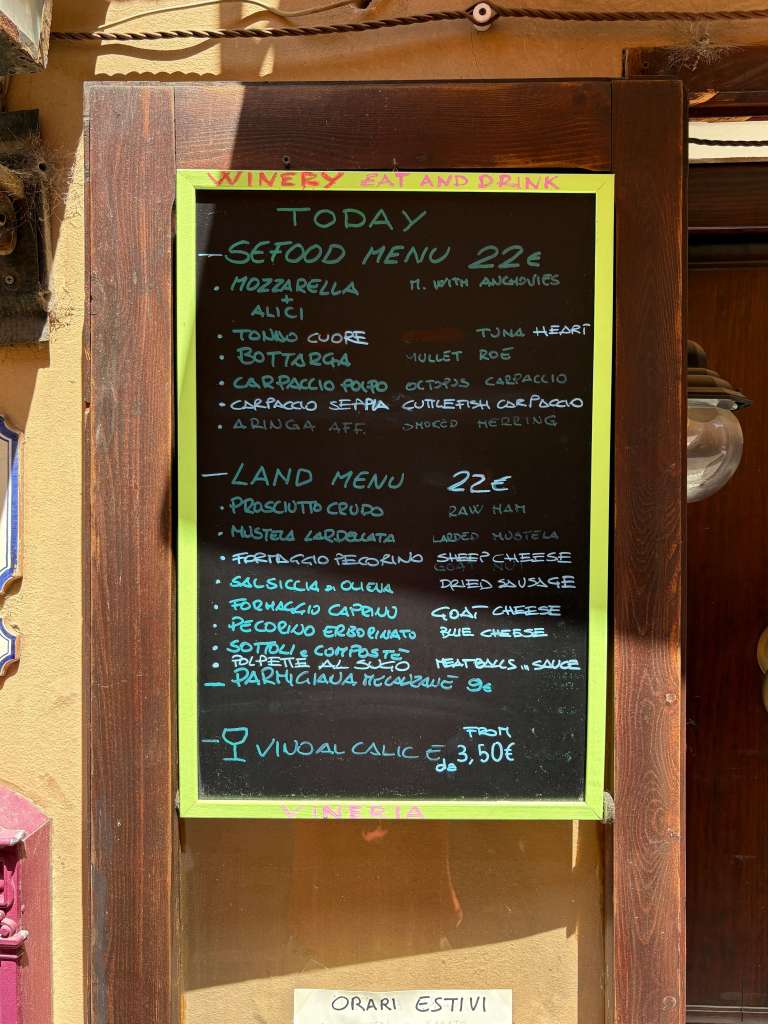 Following our visit to Iglesias, we had decided to return to a small restaurant, Enoteca Ciccimonelli, that specialised in traditional Sardinian dishes. The town was only a short distance away and we really wanted to be back in Portoscuso for our last evening so we booked an early table. The journey took us along the coast and past a stunning viewpoint we had discovered the day before. We made a point of stopping to take in the breath-taking view that we now knew was just minutes from our B&B. The restaurant was a wine bar and tapas style restaurant so we ordered a number of dishes to share and enjoyed some of the best food we had eaten during our stay. As with everything on the island, the pace was slow and gentle with a real feel of personal service. We sauntered through the narrow streets back to the car knowing that we would catch some of the sunset from the clifftop viewpoint on our return trip.