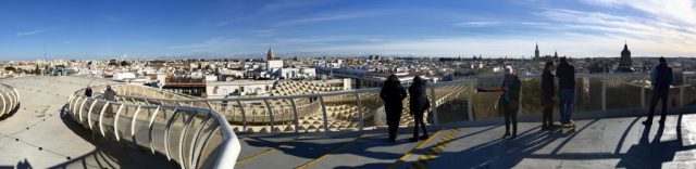 Suitably refreshed we then hoofed it up town to see some mushrooms, a sight recommended by Mrs Y, but I have to admit this was something I was just going along with and had no real idea of what to expect. But this was quite simply stunning. The Metropol Parasol to give it its official name, is a giant structure of slotted wood that looks like a collection of mushrooms that dwarfs the surrounding buildings. For 3 euros you can take a lift to the viewing platform that snakes it’s way around the top of the parasol, giving you an unparalleled view over Seville, with the ticket price including a free drink or 1 euro off your bill and you can even exchange your ticket for a postcard in the giftshop.