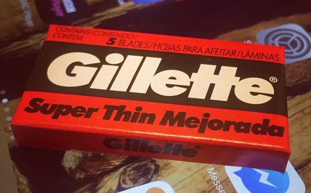 Well, I’ve discovered that you can get double edge razor blades in your local ‘fereteria‘ or hardware store.Who would have thought it? The little pack were Gillette Super Thins, made in Brazil.